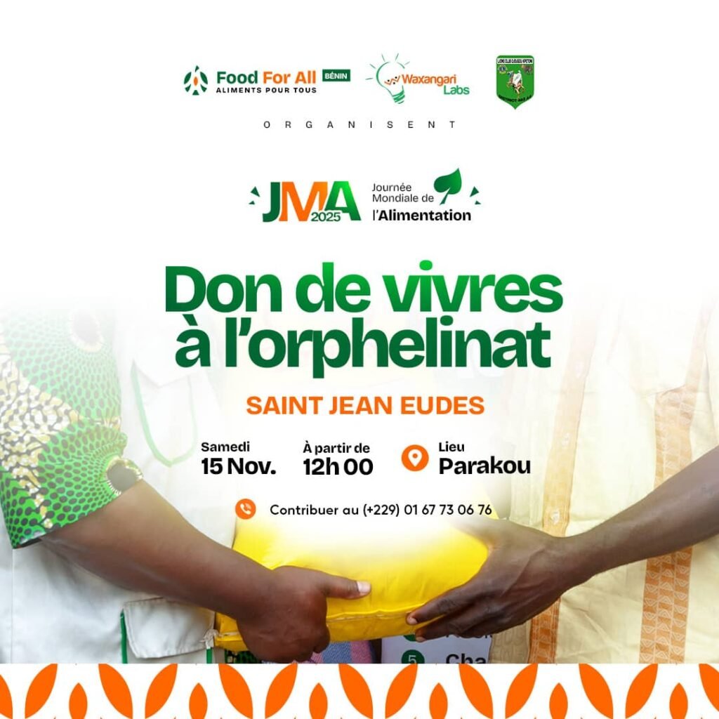 Dans le cadre de la Journée Mondiale de l’Alimentation 2025, nous unissons nos forces pour semer un peu d’amour et d’espoir. Ce 15 novembre à Parakou, nous serons aux côtés des enfants de l’orphelinat Saint Jean Eudes pour un don de vivres organisé par FOOD FOR ALL et Waxangari labs.