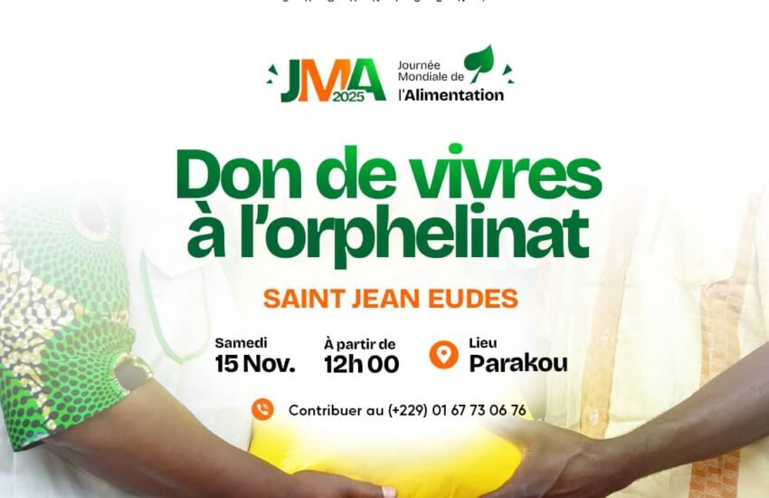 📍Lieu : Orphelinat Saint Jean Eudes, Parakou ; 🕛Heure : 12 h; Pour contribuer, appelez le (+𝟐𝟐𝟗) 𝟎𝟏 𝟔𝟕 𝟕𝟑 𝟎𝟔 𝟕𝟔